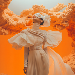 The orange sky and the soft, cloud-like background symbolise an otherworldly post-apocalyptic environment, where nature has been reshaped into something unfamiliar yet beautiful. This is a reflection of the delicate balance between human innovation and the natural world.