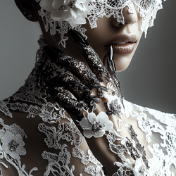 The collection presents a fresh, seductive approach to lace-inspired fashion, proving that lace can be both modern and alluring rather than traditional or old-fashioned. Featuring a range of garments including gloves, masks, gowns, and bodices, each piece is crafted with layered textures, and metallic accents.